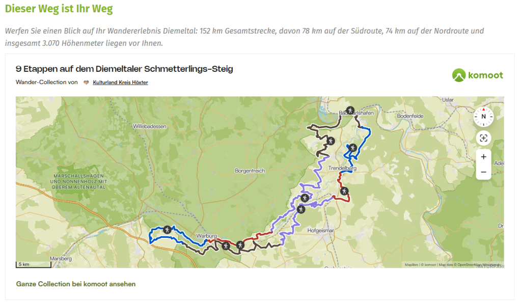 In diesem Punkt wollte ich die verschiedenen Etappen planen, allerdings findet man bei komoot schon sehr schöne Etappen-Vorschläge, die auch auf der eigenen Internetseite des Diemeltaler Schmetterlingsteigs verlinkt sind (siehe nachfolgenden Screenshot von der Internetseite http://www.diemeltaler-schmetterlingsteig.de).